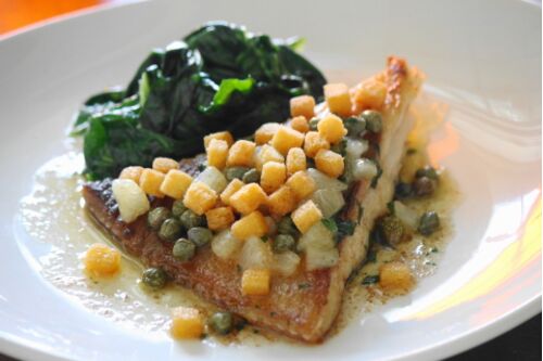 Aile de RAIE à la grenobloise, épinards juste tombés フランス産エイヒレのムニエル グルノーブル風 ほうれん草 2021年8月9月と月をまたぎ、ランチ・ディナーともにプリ・フィックスメニューの「シェフのお勧め」の枠内に名を連ねるメインディッシュです…