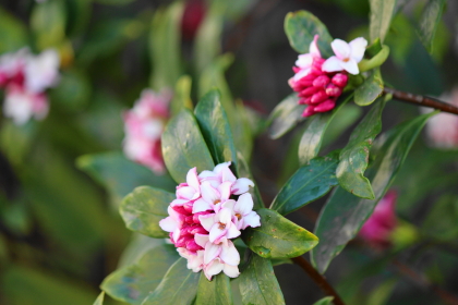 ここ数日の催花雨に促されたか、春の薫りを代表する花「ジンチョウゲ(沈丁花)」が花開きはじめています。雨降る中でも、芳しい香りを漂わせている日本の春を代表する「三大香木」です。ちなみに他の2種は、夏のクチナシ(梔子)と秋のキンモクセイ(金木犀)。クチナシは甘いバニラの香ですが、ジンチョウゲとキンモクセイは「芳香剤の香」と評され、好きではない方がいらっしゃいます。いやいや、あまりにも芳しい香りだからこそ、芳香剤に採用されたのですよ。「香りの原点は芳香剤ではなくてジンチョウゲやキンモクセイ」。都内にいても、四季折々の花々の香に出会えるにもかかわらず、化学的に作られた香りが基準になってしまうこと、あらたな現代病なのでしょうか。いや、もしかしたら香りの楽しみを奪ったものは、「花粉症」が原因なのかもしれません。公園に限らず、庭木として植樹されている方も多いので、其処彼処で目にすることができるはずです。花粉舞う時期ではありますが、天気の良い時には「春の香」に誘われるような散策にでかけてみませんか。