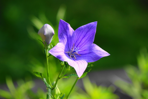 「桔梗(ききょう)の花」です。蕾が大きく膨らんでゆき、先端から5つに分かれるように花開く姿は愛らしく、さらに濃い紫色の花弁は、凛としながら陽射しにあたることで輝きを増す。馴染みのある朝顔のように、朝に花開き夕刻には一つの花の一生を終えることになる、この「はかなさ」にも美を感じるのが日本人なのでしょう。