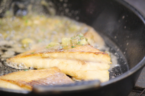 今秋のBenoitのメニューにも、「ムニエル」という単語が登場しています。ランチとディナーで魚種を変え、ほぼ同じスタイルの旬の魚料理です。ココットにバターをたっぷり溶かし込み、ふつふつと泡立つ中に魚を落とし込みます。この時、魚には小麦粉はふらず、シンプルに魚の美味しさを表現します。ココットの中では、熱々のバターをふりかける度にじゅわ~ビチビチと心地良く響く音色に、立ち昇るバターの甘い香りに香ばしい魚の香り。